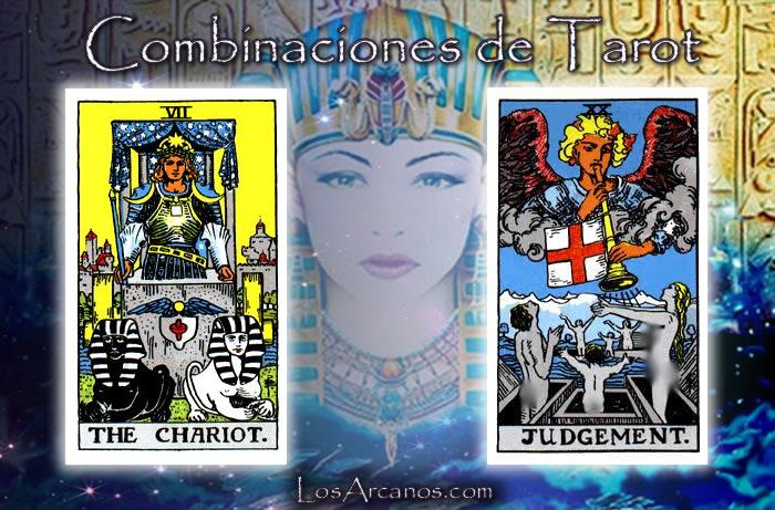 El Carro en posición normal indica éxito y avance. El Juicio invertido sugiere una falta de claridad en tus decisiones. Avanza con precaución y reflexiona sobre las consecuencias antes de actuar.