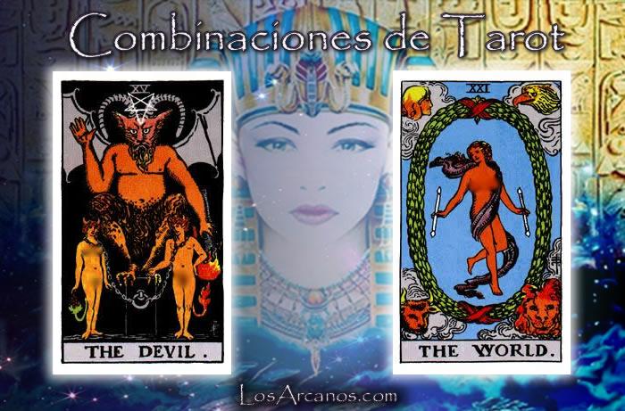 Es con total seguridad una de las combinaciones de El Diablo con otras cartas del tarot que mitigan la negatividad de este arcano mayor, siendo la unión con El Mundo un presagio que invita a ser optimista.
