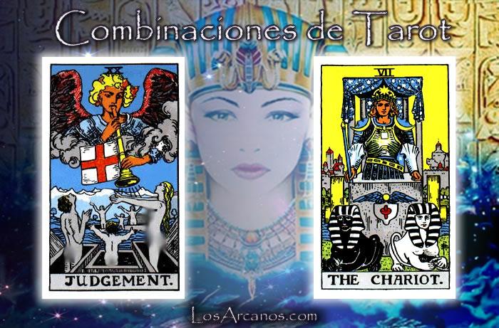 El Carro en posición normal indica éxito y avance. El Juicio invertido sugiere una falta de claridad en tus decisiones. Avanza con precaución y reflexiona sobre las consecuencias antes de actuar.