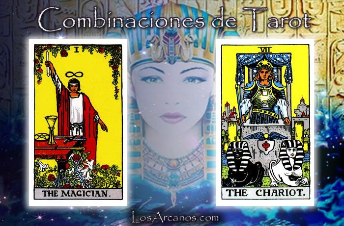 El Mago en posición normal representa el poder y las habilidades para lograr tus objetivos. El Carro invertido señala obstáculos y falta de control. Enfrenta desafíos con confianza y determinación para alcanzar tus metas.