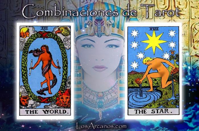 En el Tarot, la combinación de El Mundo y La Estrella es una unión muy positiva y poderosa, ya que ambas cartas representan energías elevadas y de gran significado en el proceso de crecimiento personal, espiritual y de culminación de etapas.