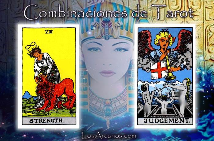 La Fuerza invertida señala la lucha interna o la falta de autocontrol. El Juicio, en su posición normal, invita a la reflexión y el despertar. Supera tus conflictos internos para tomar decisiones con sabiduría