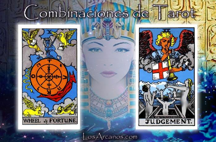 La Rueda de la Fortuna en posición normal augura cambios positivos y oportunidades. El Juicio invertido sugiere resistencia al cambio o falta de autoevaluación. Abraza las nuevas posibilidades con confianza y reflexiona sobre tu camino interior.