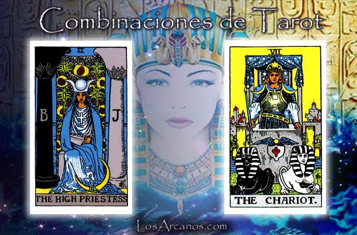 La Sacerdotisa invertida indica desconexión con tu sabiduría interna. El Carro sugiere un avance decidido y controlado. Reconecta con tu intuición para dirigir tu camino con mayor claridad y propósito.