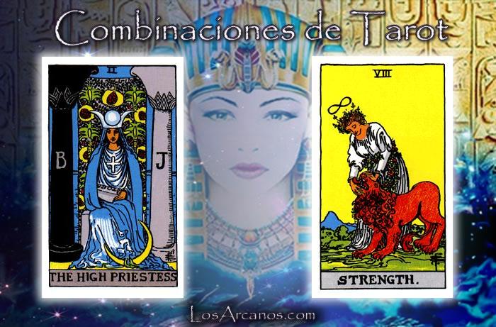La Sacerdotisa en posición normal indica la intuición y el conocimiento interno. La Fuerza invertida sugiere la necesidad de controlar impulsos. Confía en tu sabiduría interior para dominar situaciones desafiantes con calma y serenidad.